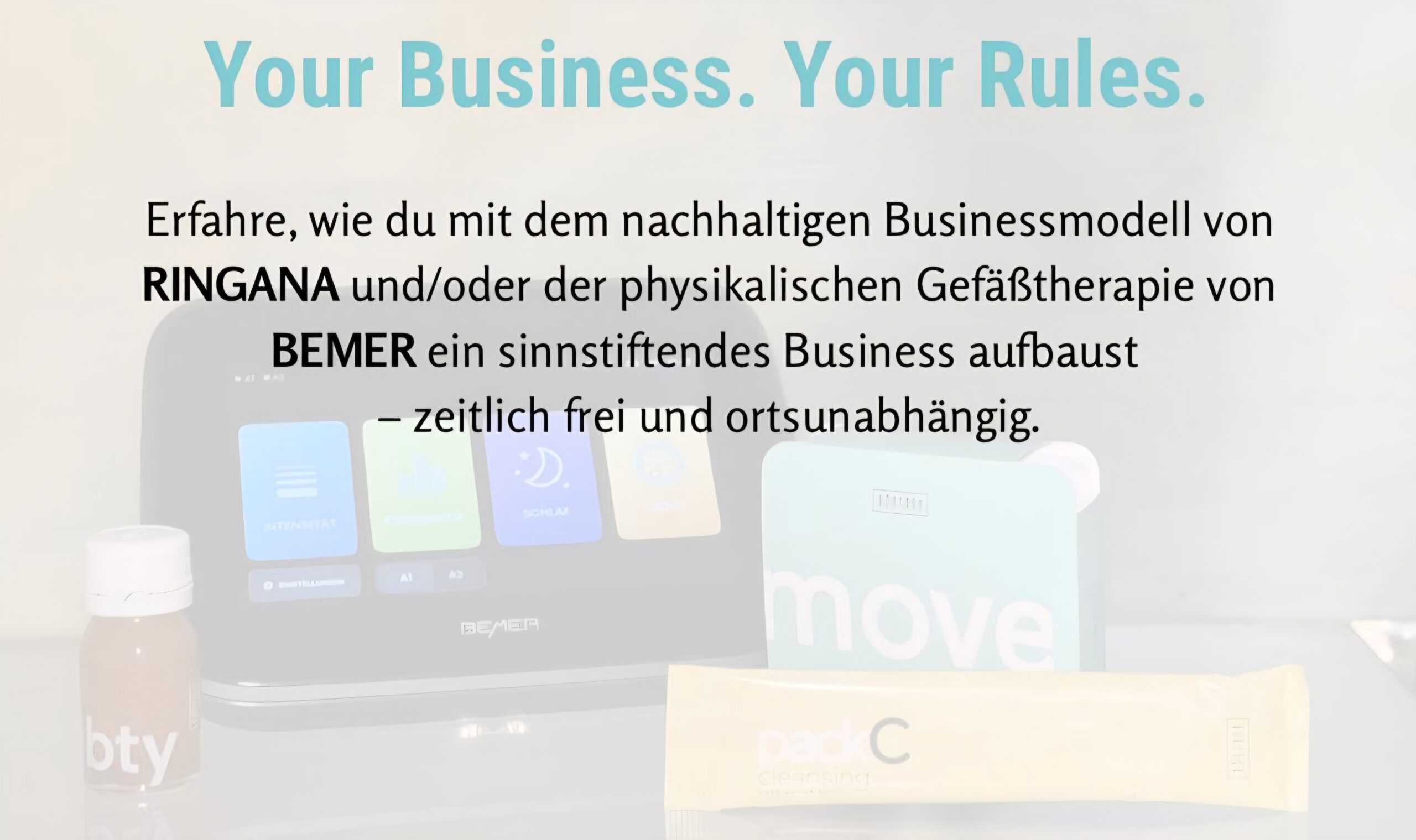 Erfahre, wie du mit dem nachhaltigen Businessmodell vor RINGANA und/oder der physikalischen Gefäßtherapie von BEMER ein sinnstiftendes Business aufbaust – zeitlich frei und ortsunabhängig.